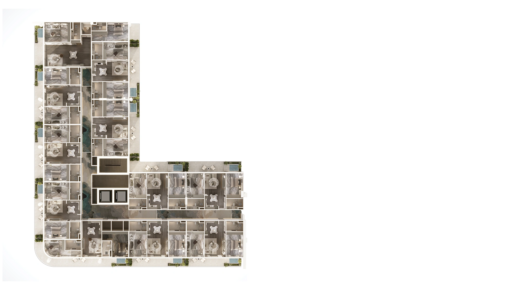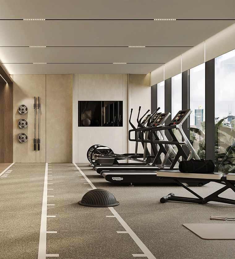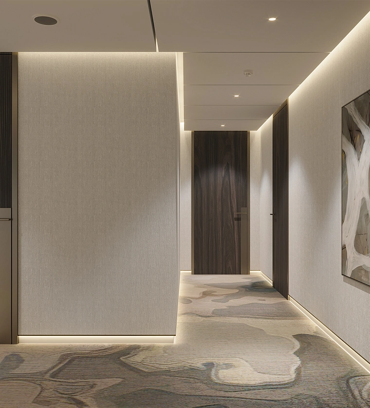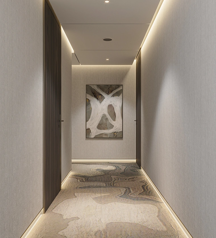 In the corridor, you’ll find hotel-style soft carpeting and ambient perimeter lighting, creating a warm and welcoming atmosphere.