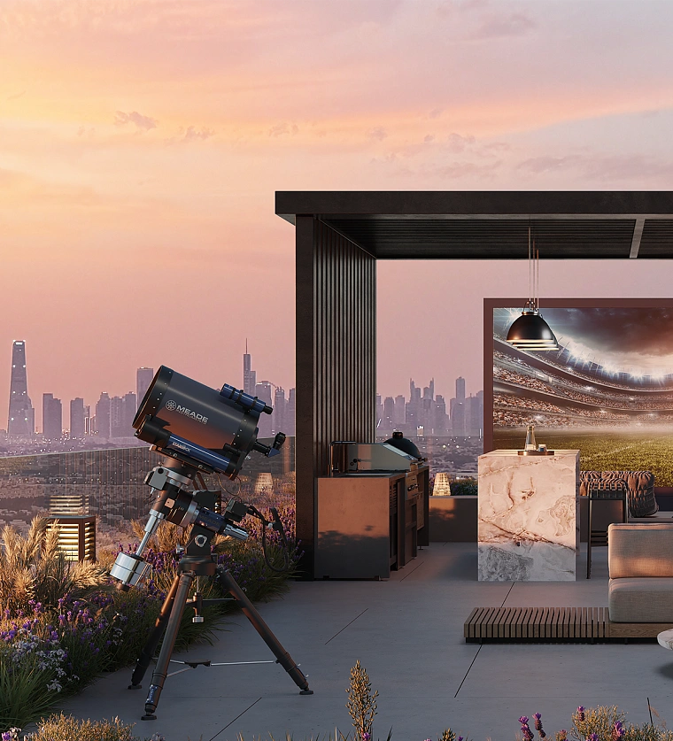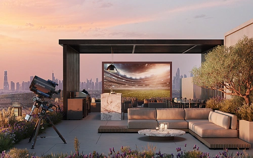 An observatory and a cinema are located on the roof of the house under the starry sky, creating a unique atmosphere.