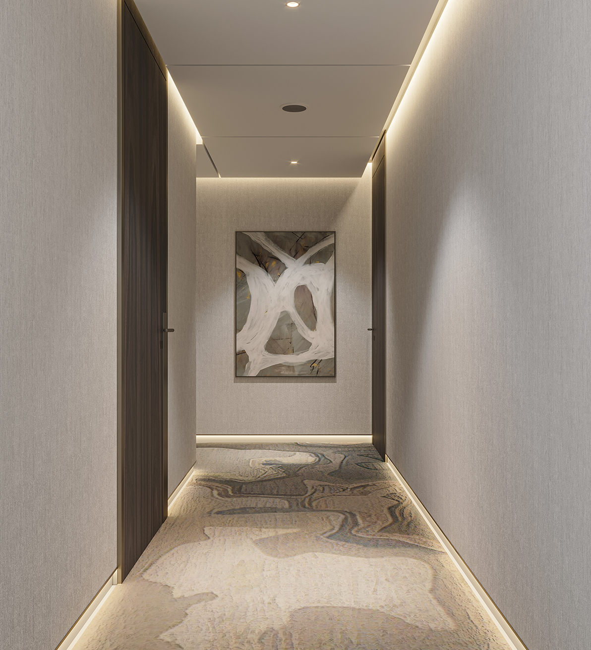 В коридоре гостиничный ковролин и подсветка по периметру, создающие уютную атмосферу.